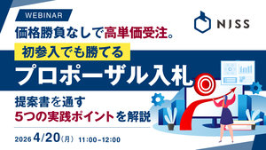本セミナーでは、入札市場への参入を検討している方に向けて、資格取得の方法から案件情報の収集、応札までの一連のステップをわかりやすく解説します。入札市場の全体像を把握したうえで、全国8,900以上の発注機関の入札情報を一括検索でき、過去の落札結果や仕様書まで確認可能な入札情報速報サービス「NJSS」を活用した効率的な情報収集の方法もご紹介しますので、「何から始めればいいかわからない」という状態から具体的なアクションが明確になるはずです。入札初参入でも着実に進められる実践的な内容ですので、新たな販路開拓をお考えの経営者・営業責任者の方はぜひご参加ください。
