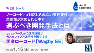 本セミナーでは、Javaベースかつ汎用技術に基づいた「Wagby EE」のアーキテクチャや、実際の業務に即したカスタマイズ性、内製運用における現実的な活用方法を他ツールとの比較も交えてわかりやすく解説します。また、ワンプライスで必要機能を網羅できる製品構成や国産ならではのサポート体制など選定時に重視される観点についても紹介し、ノーコードの次のステップを検討される方、ノーコードでは不十分だと感じられている方にとっての具体的なヒントを提供します。