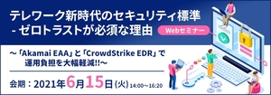 新型コロナウイルス感染症が猛威を振るう中、企業では新しい就業環境の構築が急務となっています。 東京都では、中小企業を対象に「週3日・社員の7割以上」のテレワーク実現を支援する「テレワーク・マスター企業支援事業」を展開する等、テレワークの定着を推し進めています。 しかし、テレワークの導入には、運用面とセキュリティ対策の課題解決が必要です。 本セミナーでは、ワークライフバランス提唱の第一人者である内閣府 地域働き方改革支援チーム 渥美 由喜氏をお招きし、コミュニケーション方法やセキュリティの重要性など、幅広い視点からテレワークをめぐる現状や課題をご紹介。 さらに、有効なセキュリティ対策であるゼロトラストの重要性を解説。 CrowdStrikeとAkamaiの連携による、「人」と「端末」のより強固で簡単なゼロトラストの導入をご提案します。