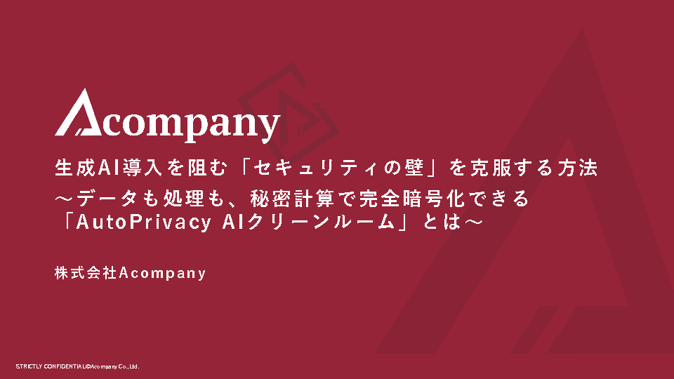 本セミナーでは、データも処理も暗号化したまま扱える 「AutoPrivacy AIクリーンルーム」 をご紹介します。本プロダクトは 秘密計算技術をベースにしており、ハードウェアレベルの安全領域(TEE:Trusted Execution Environment) 内でのみAI処理を実行します。 これにより、入力データや処理途中の情報が社内外の誰からも見えず、外部への漏洩リスクを技術的に排除します。さらに、AIモデルも秘匿可能なため、 機密情報を活用しながら生成AIを安全に本番業務へ適用 できます。汎用LLMでは得られない高精度な出力と業務適合性を実現し、金融・製造・医療・防衛など、セキュリティ要件が厳しい分野でも導入可能です。これまで安全性の壁で導入を見送っていた企業にこそ、突破口となるソリューションです。