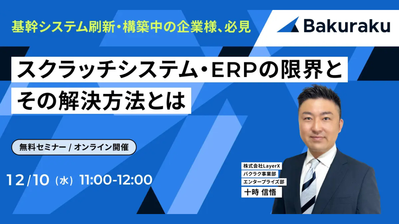当日は、基幹システムが本来得意としている領域と、苦手としている領域を整理した上で、苦手としている領域をどう「フロントERP」で解決できるのか、実際のデモンストレーションも交えて解説します。
