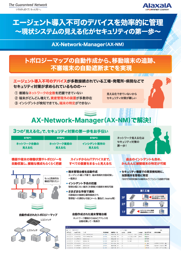本セミナーでは、アラクサラネットワークスが提供するネットワーク可視化・監視ソリューション「AX-Network-Manager」、およびフォーティネット社のNDRソリューション「FortiNDR」や脅威検知・分析ツール「FortiDetector」を通じて、EDR非対応端末を含むネットワーク全体を守るための“非エージェント型セキュリティ強化の実践法”をご紹介します。