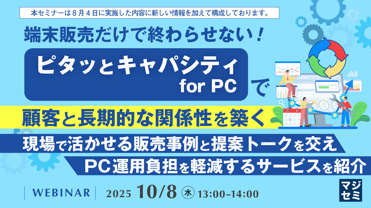 本セミナーでは、PCのライフサイクル全体に対応した運用支援サービス「ピタッとキャパシティ for PC」のサービス内容や導入メリットを、わかりやすく解説します。顧客企業の情シスが抱えるPC運用管理の課題に対して、このサービスがどのように応えているのか、その仕組みとポイントを紹介します。さらに、実際に販売店がエンドユーザに提案・導入を実現した販売事例や、商談で使える提案トークの流れも交えて、現場での提案に活かせる具体的なヒントをご提供します。「端末販売だけで終わらない」提案に取り組みたい方にとって、すぐに活用できる実践的な内容です。