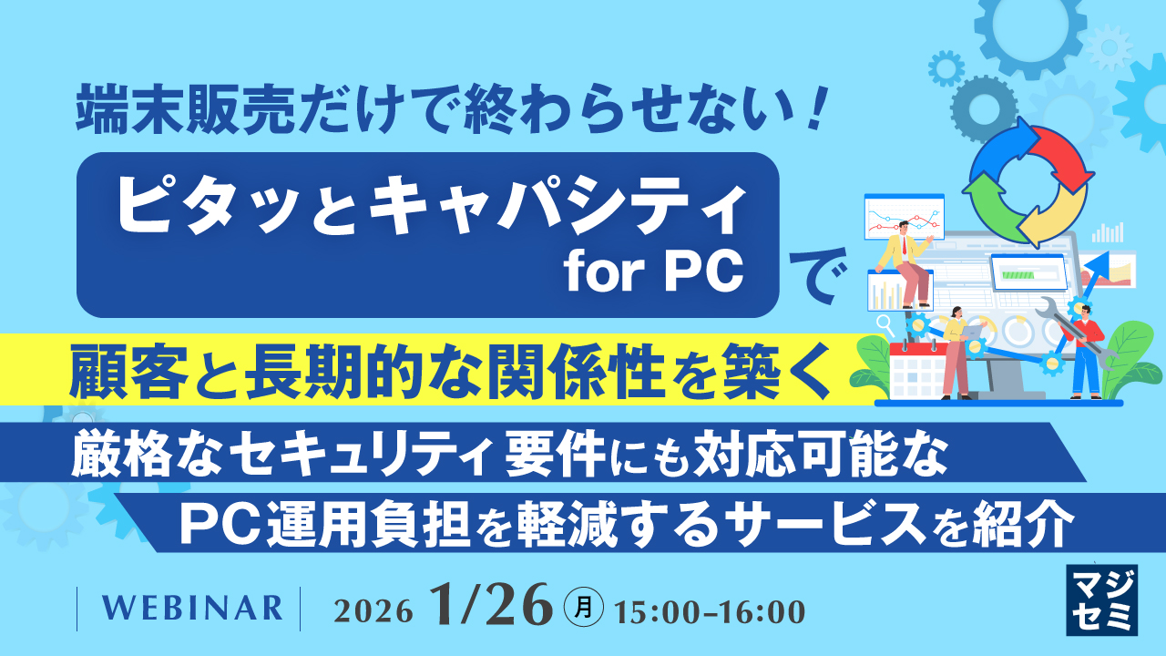 本セミナーでは、PCのライフサイクル全体に対応した運用支援サービス「ピタッとキャパシティ for PC」のサービス内容や導入メリットを、わかりやすく解説します。顧客企業の情シスが抱えるPC運用管理の課題に対して、このサービスがどのように応えているのか、その仕組みとポイントを紹介します。さらに、個人情報や機密情報を取り扱う事業者や官公庁・自治体など、厳格なセキュリティ要件への対応が求められる顧客向けサービス「ピタッとキャパシティ for PC Advance」も紹介します。「端末販売だけで終わらない」価値ある提案につなげるためのヒントをお届けする内容です。ぜひご参加ください。