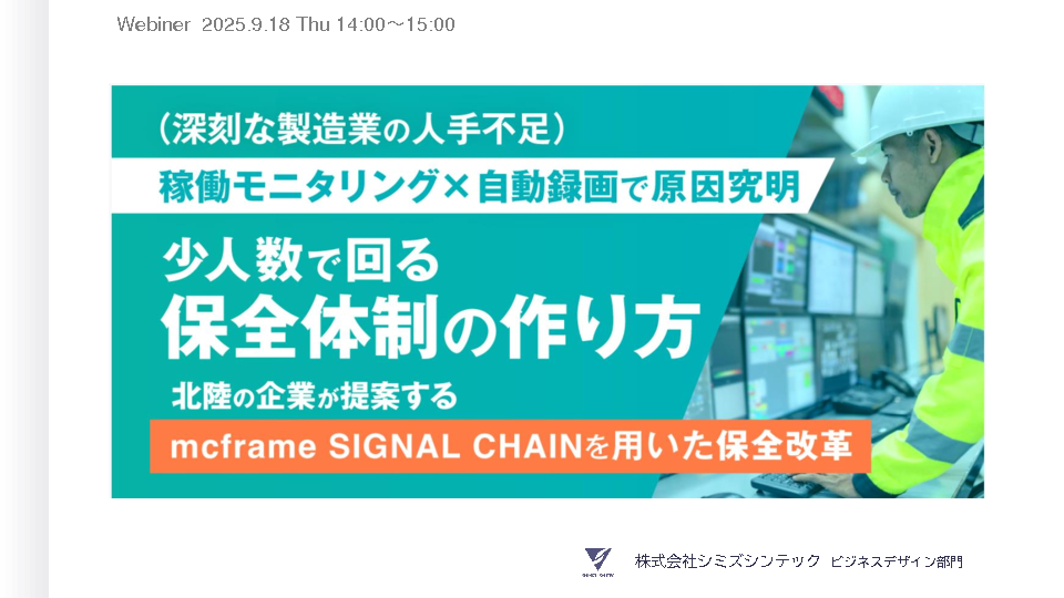 本セミナーでは、ビジネスエンジニアリング株式会社が開発した保全DXパッケージ「mcframe SIGNAL CHAIN」を活用し、設備の稼働データや点検・修理履歴といった保全データを一元管理し、製造業が抱える保全業務の人手不足や属人化といった課題を解決する具体的な方法について解説します。