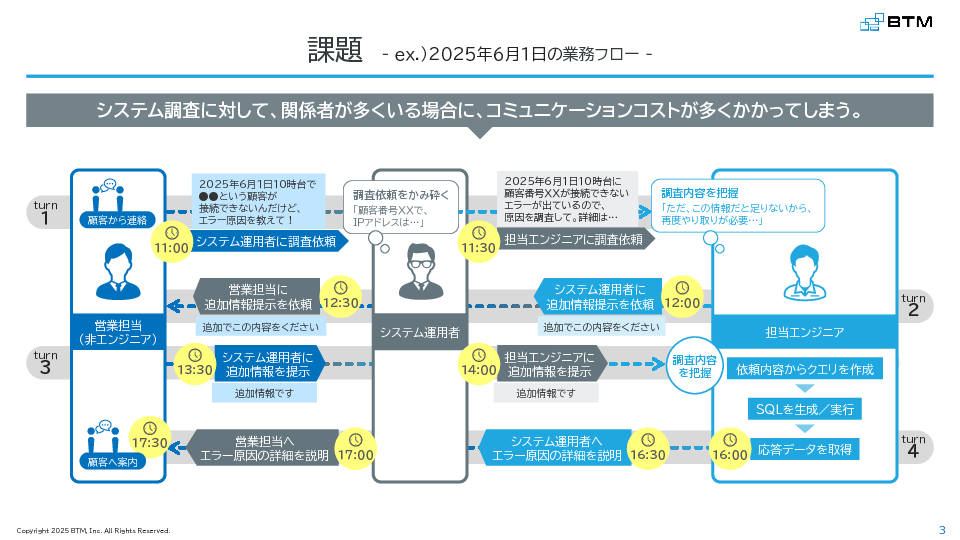 障害対応の現場では、依頼者からの問い合わせ内容を窓口担当が聞き取り、システム担当やエンジニアがその内容を再確認するという「ヒアリングの往復」が頻繁に発生しています。この過程で、ログ取得範囲の誤解や発生条件の不明確さが生じ、再調査や追加ヒアリングが必要になることもしばしばです。