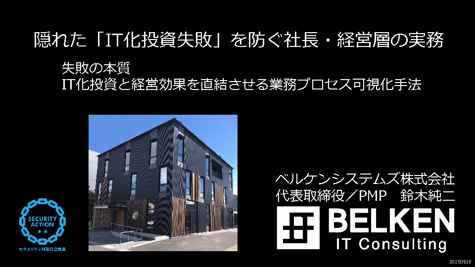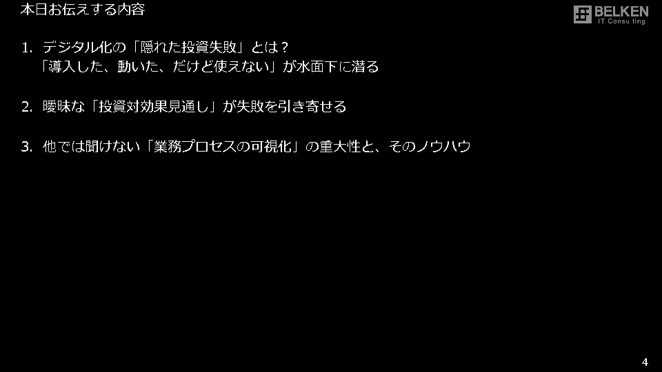 13:05~13:45 隠れた「IT化投資の失敗」を防ぐ社長・経営層の実務 ~失敗の本質・IT化投資と経営効果を直結させる業務プロセス可視化手法~