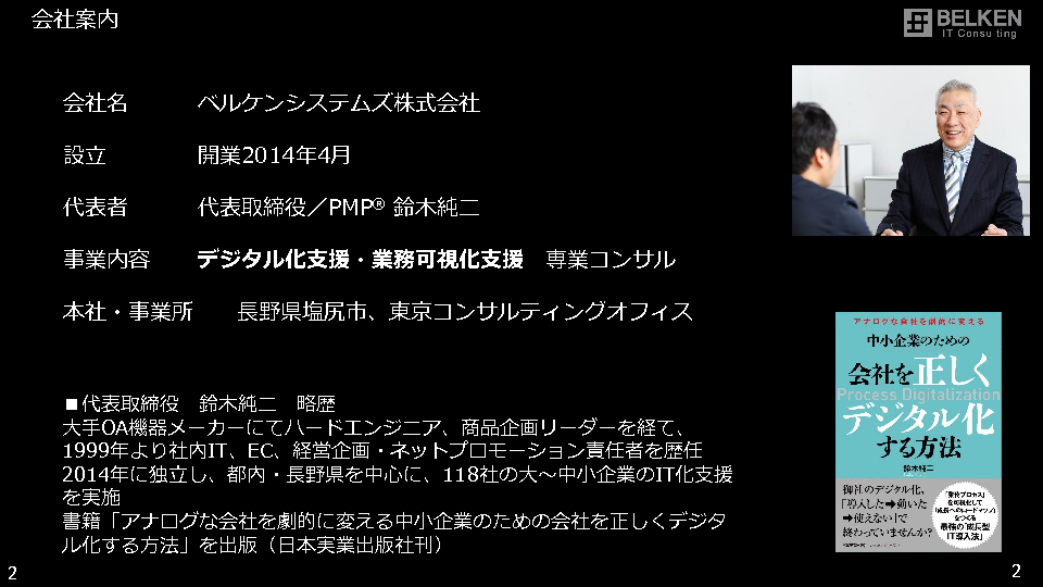 システム化を進めるための必須ステップである「業務プロセスの可視化」「経営面で価値がある効果目論見の設定」について、創業以来110社を超えるコンサルティング実績から発案した独自手法「業務プロセス管理図」による可視化・分析手法をはじめ、IT業者からは決して聞けない可視化専門コンサルならではのノウハウをわかりやすく説明します。この必須ステップを踏むことにより、小さい投資規模でも経営・現場業務の両面で確実な効果を得られ、事業成長に貢献するIT投資の成功角度を上げることができるのです。