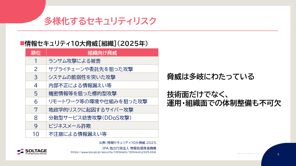 サーバーやネットワークなどのITインフラを狙うサイバー攻撃は年々増加しており、セキュリティホールを突かれる事例も後を絶ちません。クラウド利用の拡大に伴い、クラウド環境特有のリスクや、VPN機器を介したランサムウェア侵入といった外部公開資産への攻撃が顕著になっています。