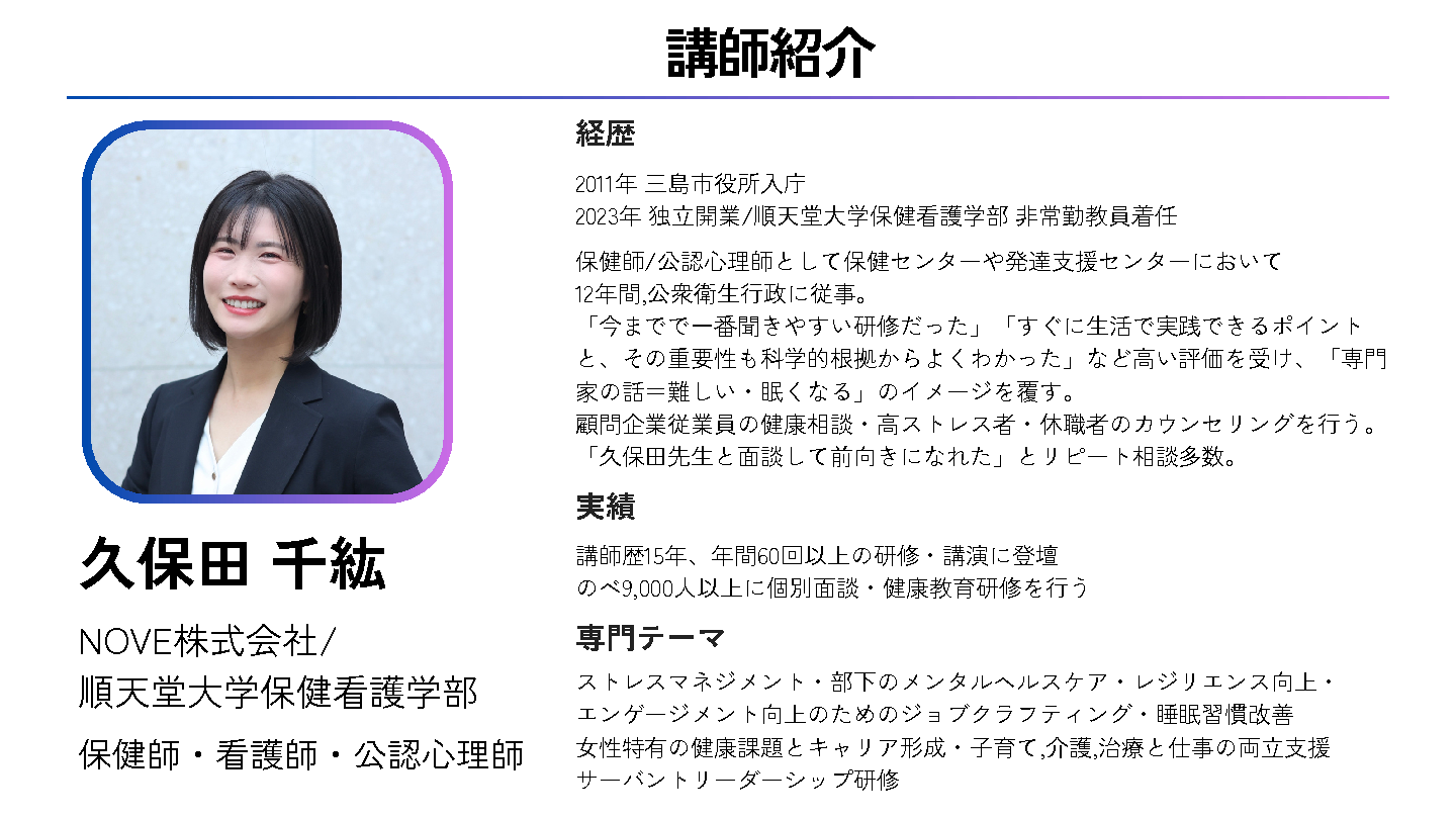 11:05~11:45 【人事担当者向け】ストレスチェック義務化後、チェック結果は有効に活用できていますか? ~高ストレス者の個人フォローと傾向分析で、実施から職場改善まで一気通貫で伴走~