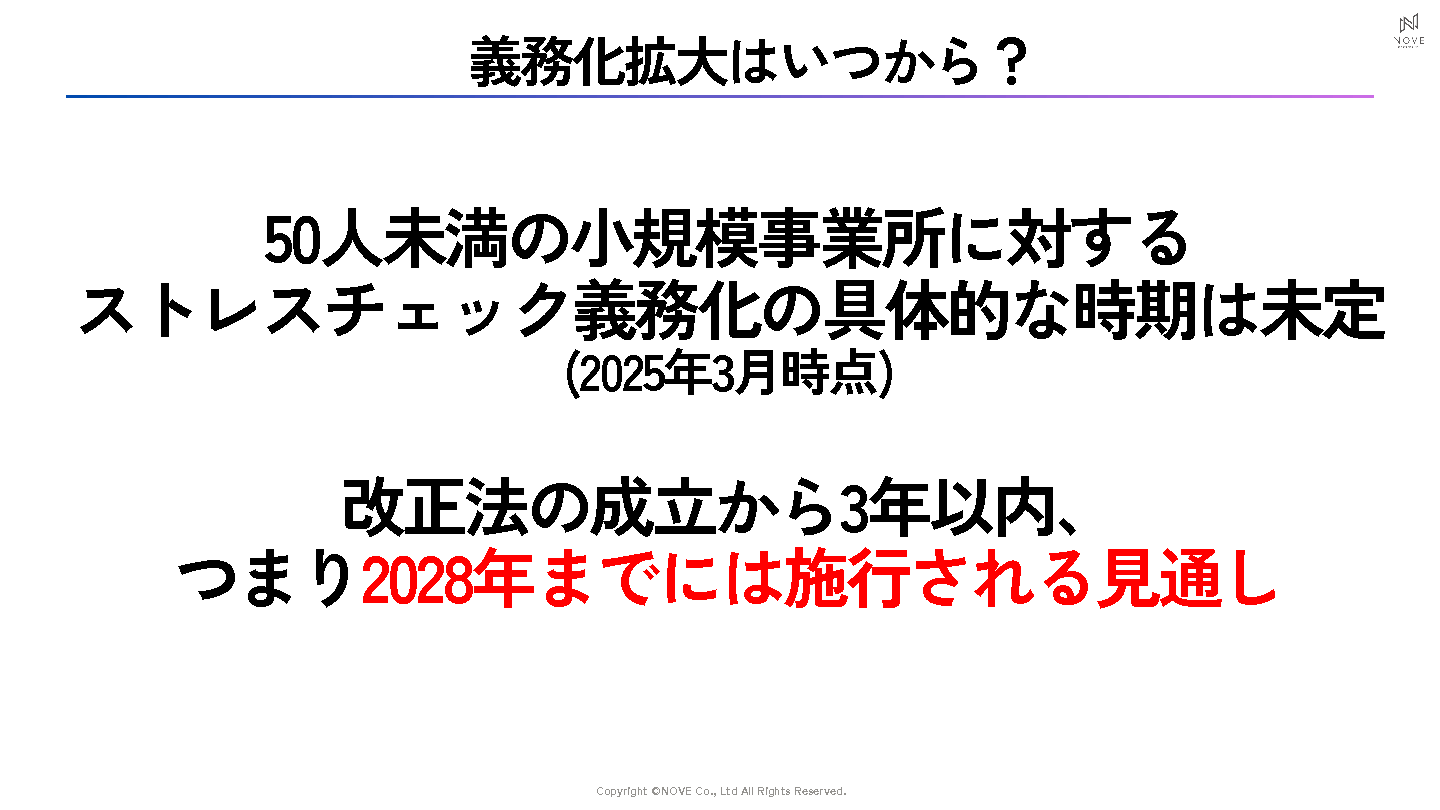 ストレスチェック制度の義務化から数年が経ち、多くの企業で実施が定着しました。加えて、 2025年5月の法改正 により、これまで対象外だった 50人未満の事業場でもストレスチェックが義務化され、今後3年以内(遅くとも2028年5月まで)にすべての事業場での実施が求められる見通し です。一方で、その「実施レベル」と「活用度」には大きな差があります。中堅・中小企業はもとより大企業においても、義務だから実施することが目的化しており、フォロー体制や職場改善まで手が回らないケースが多く見られます。制度の対象が広がる今こそ、“形だけの実施”から“実効性のある活用”への転換が求められています。