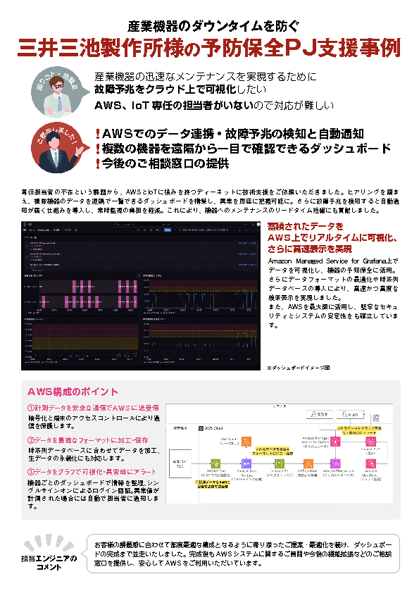 本セミナーでは、三井三池製作所が取り組んだ、IoTセンサーとAWSを活用した設備・機器の予防保全の実践事例を詳しく紹介します。