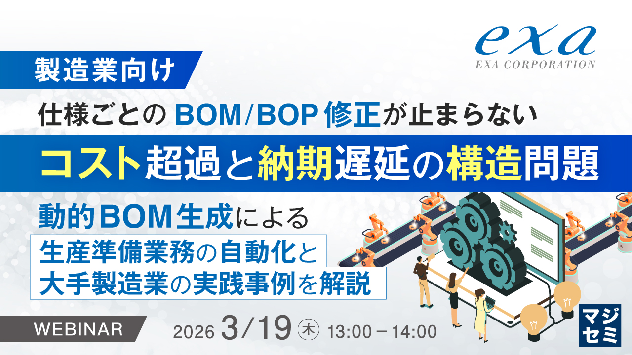 13:05~13:45 【製造業向け】仕様ごとのBOM/BOP修正が止まらない コスト超過と納期遅延の構造問題~動的BOM生成による生産準備業務の自動化と大手製造業の実践事例を解説〜