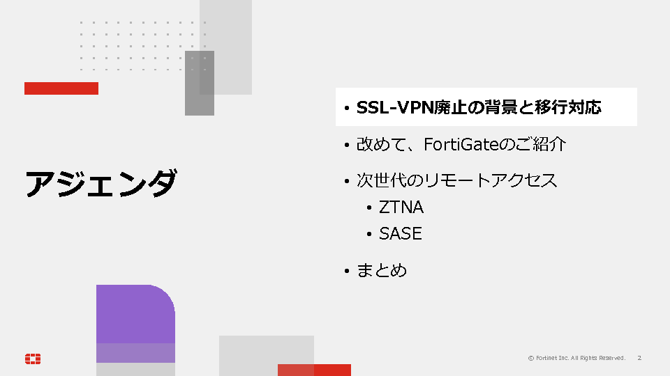 14:05~14:45 FortinetがSSL-VPN廃止を表明、FortiGateユーザーはどう備えるべき?~VPN依存のリモートアクセスから脱却し、ゼロトラストへ段階的に移行する“現実的なステップ”を解説~