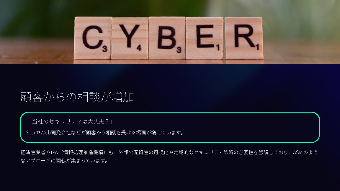 経済産業省やIPA(情報処理推進機構)も、外部公開資産の可視化や定期的なセキュリティ診断の必要性を強調しており、ASMのようなアプローチにも関心が集まっています。今こそ“セキュリティも相談できる”パートナーとしての対応力が求められています。
