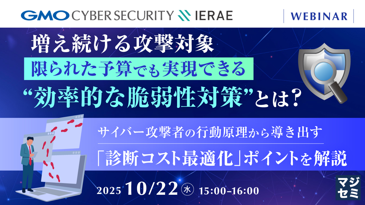 さらに攻撃者の行動原理を踏まえた上で、限られた予算でも効率的に脆弱性管理を実現する方法をご提案します。特に「組織内の様々な部署が大量のサイト(ドメイン)がある」「子会社やグループ会社など多くの外部公開IT資産の管理に課題がある」という方にお勧めのセミナーです。効率的な脆弱性管理による「診断コスト最適化」のポイントを知りたい方は、ぜひご参加ください。