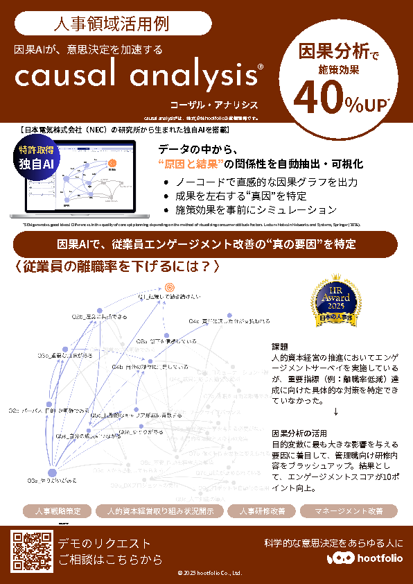 NECの研究所で生まれた因果AI「causal analysis」を通じて、専門的な統計スキルがなくても、データにおける原因と結果の関係を視覚的・定量的に把握し、人事施策や経営判断における意思決定を支援しています。