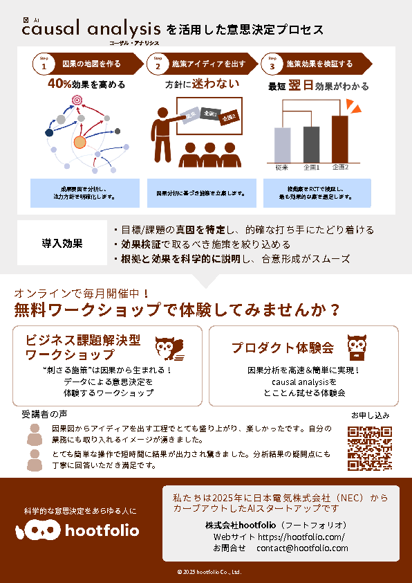 株式会社hootfolioは、「科学的な意思決定を、あらゆる人に」を掲げ、2025年に日本電気株式会社(NEC)からカーブアウトしたスタートアップです。