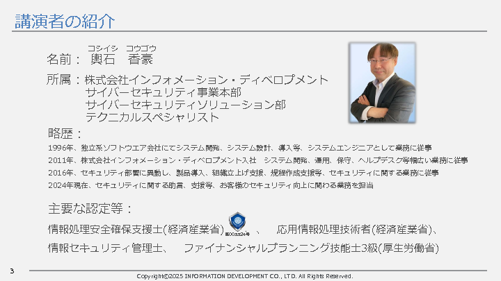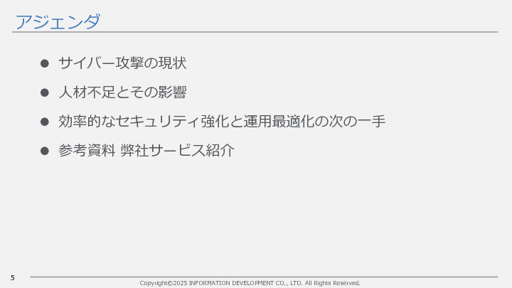 そこで本セミナーでは、主に1,000人以上の大規模企業・組織のセキュリティ運用部門や担当者の方を対象に開催します。インフォメーション・ディベロプメントが、最新の脅威動向や“伴走型支援”によるセキュリティアドバイザリサービスの活用方法を紹介。人材不足の現場で運用力を底上げするヒントをお伝えします。