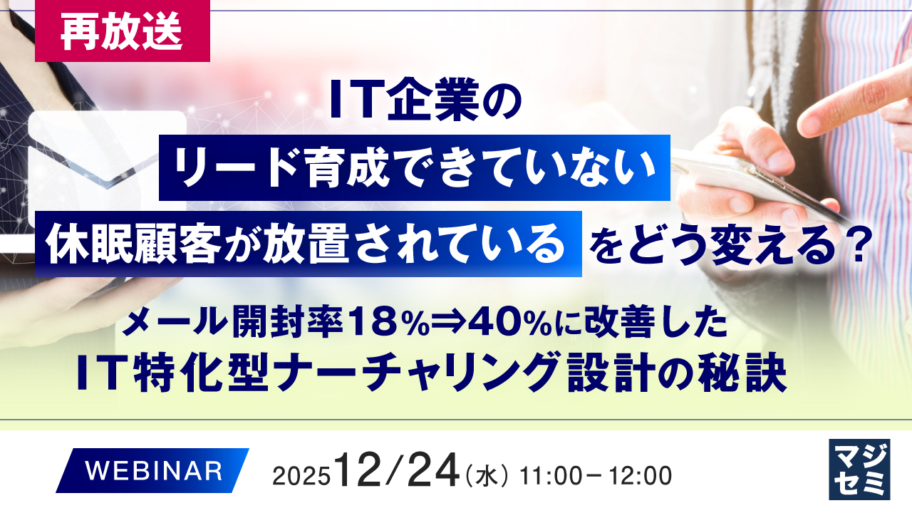 11:05~11:45 IT企業の「リード育成できていない」「休眠顧客が放置されている」をどう変える? ~メール開封率18%⇒40%に改善したIT特化型ナーチャリング設計の秘訣~
