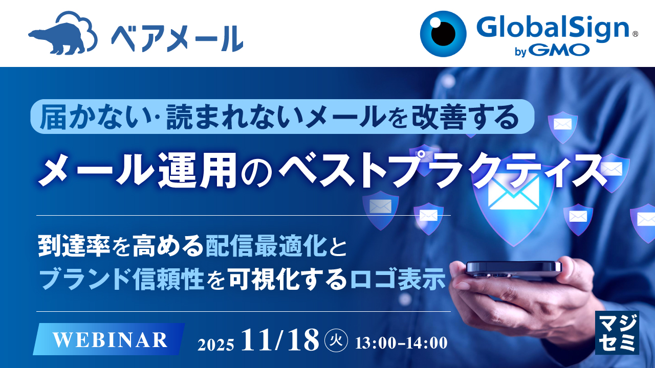 本セミナーでは、まず株式会社リンクの「ベアメール」を活用して、DMARCの設定も含めた配信基盤を最適化し、迷惑メール判定や不達といった課題を解消し、メールを届かせる最適な方法をご紹介します。続いて、DMARCの次に注目を集める、受信者に信頼を伝えるロゴ表示技術「BIMI」の仕組みや開封率などにおけるメリットを、BIMIに必要な「VMC(企業ロゴ所有証明書) byGMO」を提供するGMOグローバルサイン株式会社より解説します。配信品質の改善からブランド価値の向上までを段階的に実現するベストプラクティスを通じて、メールマーケティングの成果を最大化するための実践的な手法をお伝えします。