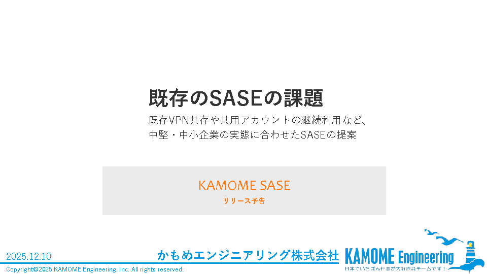 本セミナーでは、既存のVPN網や共用アカウント運用を維持しながら、段階的にゼロトラスト化を進める現実的なSASEアプローチを解説します。また、中堅・中小企業に必要な機能に絞り込み、コストを抑えつつセキュリティ水準を高める「KAMOME SASE」を紹介。さらに、拠点間・システム間通信への対応など柔軟な構成例を提示します。理想論ではなく、現場が“今日から取り組めるSASE運用”を具体的に示す内容です。