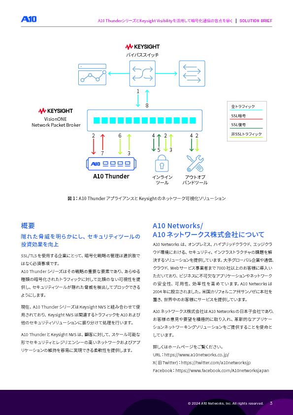 本セミナーでは、キーサイト・テクノロジーとA10ネットワークスのソリューションを組み合わせることで、暗号化通信をネットワークレイヤで適切に前処理し、NDRやIDSなどのネットワーク型検知ツールへ「検知すべき通信だけ」を効率的に振り分けるアーキテクチャをご紹介します。A10ソリューションでSSL/TLS通信を復号し、KeysightのTAP/パケットブローカーにより復号後の通信を取得・整流・分配します。さらに、インライン構成ではKeysightのバイパススイッチを組み合わせることで、復号装置やモニタリング機器に障害が発生した場合でも通信を迂回させ、ネットワーク停止を防ぐ高可用な構成を実現します。