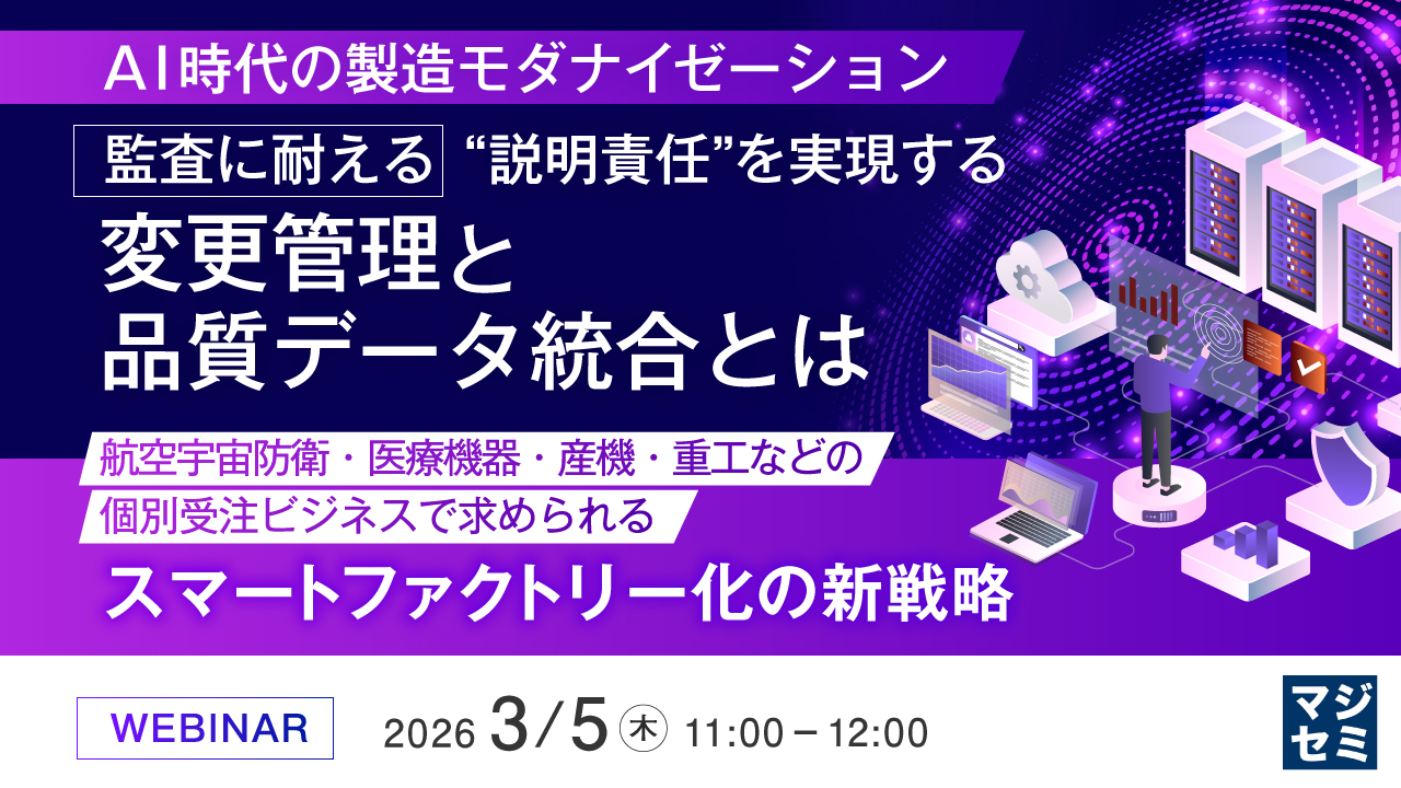 11:05~11:50 AI時代の製造モダナイゼーション 監査に耐える“説明責任”を実現する変更管理と品質データ統合とは~航空宇宙防衛・医療機器・産機・重工などの個別受注ビジネスで求められるスマートファクトリー化の新戦略~