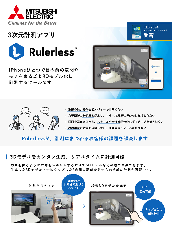 『Rulerless(ルーラレス)』は、iPhoneのLiDARを活用して、3D空間を手軽にモデル化できる革新的な計測ソリューションです。iPhoneで動画を撮るようにスキャンするだけで、数cm誤差レベルの3Dモデルを自動生成。タップ操作で直感的に長さを測定でき、セキュアなクラウドで社内外とも共有可能です。