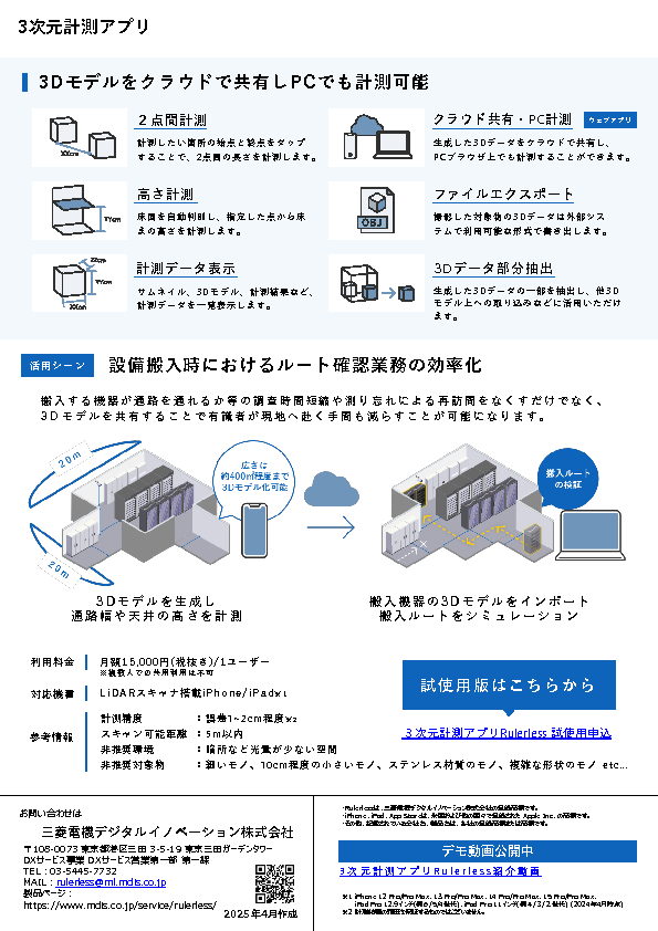 本セミナーでは、「スマホ×クラウド」を活用した新しい3D計測ソリューション『Rulerless(ルーラレス)』を用いて、現場計測を劇的に効率化する方法を、実際の適用事例とともに詳しく解説します。