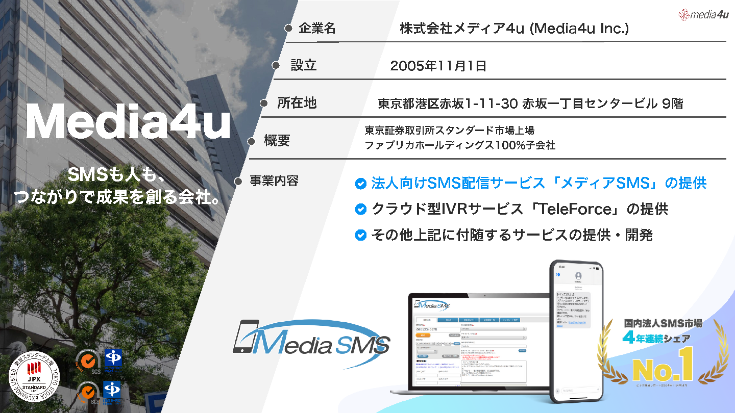 本セミナーでは、日々大量の本人認証が求められる大手フリマアプリやキャッシュレス決済サービスなどで採用され、 4年連続シェアNo.1 を誇る SMS・IVR認証サービス「メディアSMS」 をご紹介します。本サービスは、SMS認証専用に構築された独自インフラ上で稼働しており、国内キャリア直収による 到達率99.9% という圧倒的な信頼性を実現。さらに、電話自動発着信(IVR) にも対応しており、ガラケーや固定電話のみのユーザー層にも確実に認証が届く仕組みを備えています。