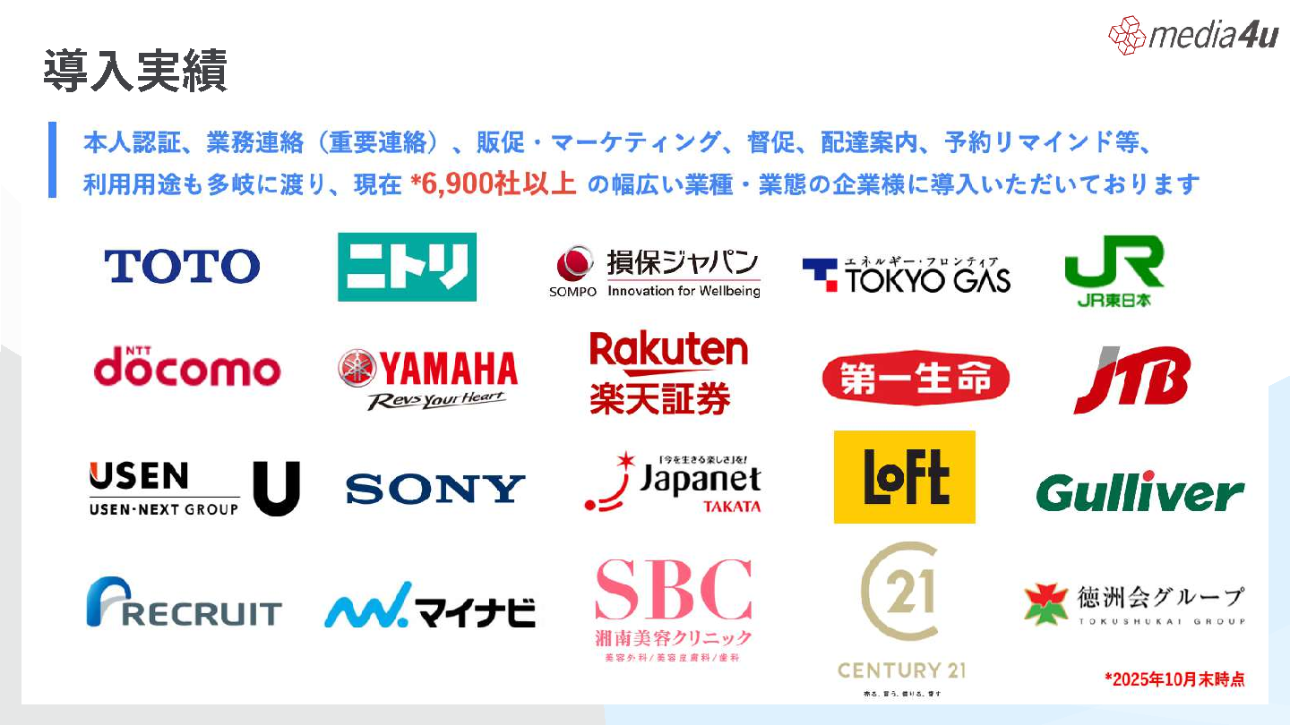 本セミナーでは、99.9%の到達率を実現する「メディアSMS」の活用事例と基本機能を紹介します。大手金融機関や官公庁をはじめとする 約6,900社への導入実績 を有し、国内法人向けSMS市場で 4年連続配信数シェアNo.1 という高い信頼性を誇ります。URL付き通知やクリック数の可視化、業務に応じたテンプレート機能など、通知精度と効率を両立する機能も充実。