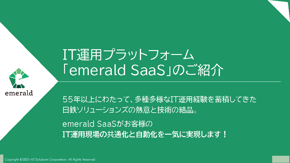 本セミナーでは、NSSOLが55年以上にわたり培い、100社以上の企業で活用してきたIT運用知見に基づき企画開発した新サービスのご紹介を通じて、当社が理想とする運用フローやプロセスを解説していきます。加えて、運用現場の状況を定量的に見える化するNSSOL考案の「IT運用パフォーマンススコア」もご紹介。監視最適化・定型化率・自動化率といったKPIごとに改善の伸びしろを評価できる新しい改善手法です。ツールを導入するだけに終わらず、ナレッジと評価指標を組み合わせることで、改善の文化を現場に定着させ、確実に成果を生むIT運用改革を実現するための実践手法をご紹介します。