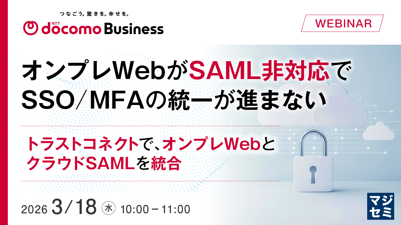 ポイントは、クラウド側のSAML連携を活かしつつ、オンプレWebも含めた認証の一元管理をめざし、SSO/MFAを「同じ方針」で適用できる状態へ段階的に近づけることです。その実現手段の一つとしてNTTドコモビジネス提供サービスの「トラストコネクト」を活用し、どのような設計方針で適用範囲を決め、無理なく運用へ落とし込むべきかを解説します。また、想定される課題への対処事例も紹介します。