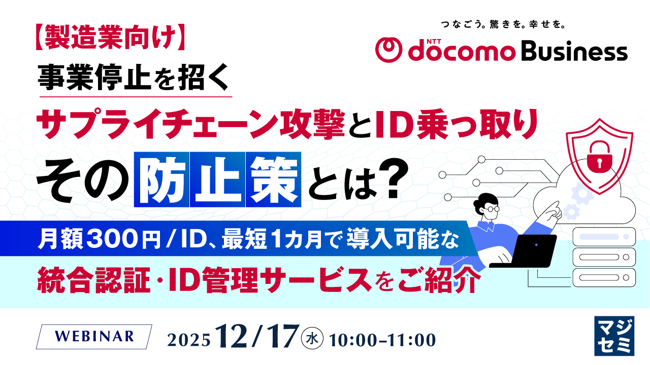 10:05~10:45 【製造業向け】事業停止を招くサプライチェーン攻撃とID乗っ取り、その防止策とは?~月額300円/ID、最短1カ月で導入可能な統合認証・ID管理サービスをご紹介~