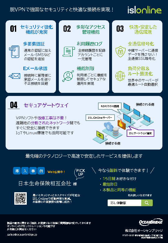 本セミナーでは、ISL Online、UserLock、Token2 、FileAuditなどのオーシャンブリッジ製品を活用し、既存のEDRを補完する「統合型防御アーキテクチャ」の実装手法を解説します。