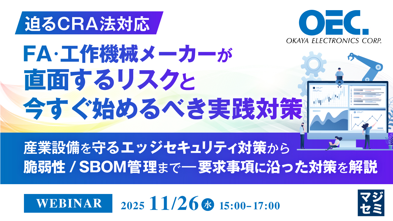 本セミナーでは、CRA法対応に課題を抱えるFA・工作機械メーカーを対象に、CRAの最新動向を踏まえながら、今から準備すべき具体的な対策や、早期に着手すべき重要ポイントを分かりやすく解説します。