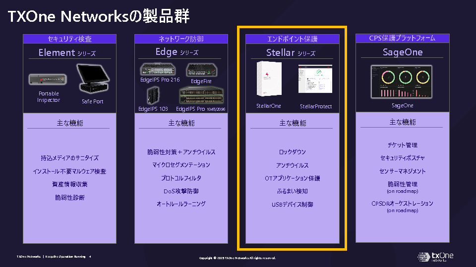 「Stellarシリーズ」は、TXOne Networksが提供する、OT環境に最適化されたエンドポイントセキュリティソリューションです。アンチウイルス製品のようなパターンファイルの更新やインターネット接続を必要とせず、ネットワーク分離環境でも確実に動作します。レガシー端末や重要インフラを守るために設計された、軽量かつ高信頼な製品です。