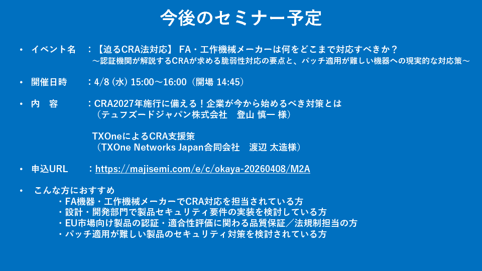 さらに、自社製品が顧客環境で長期間稼働することを前提とし、「すぐにパッチを適用できない設備」をどのように守るのかについても取り上げます。TXOne Edgeシリーズを活用したネットワーク防御およびエンドポイント保護の実践手法を、用途・リスクレベル別のセキュリティバンドル構成例や導入パターンとともにご紹介します。