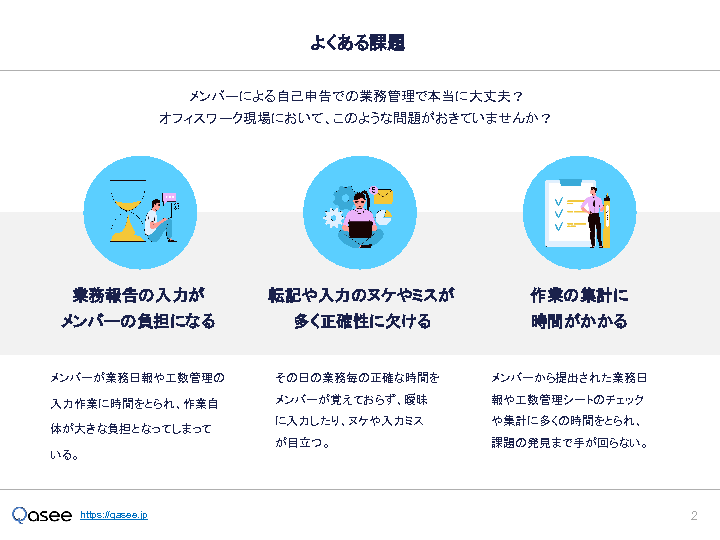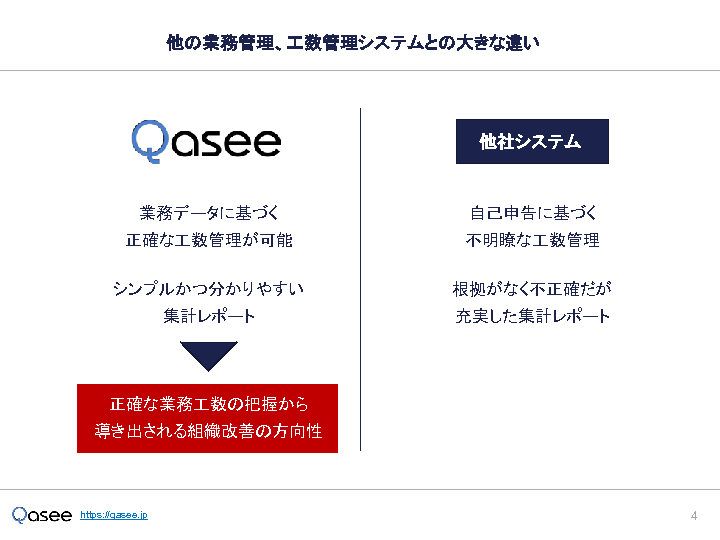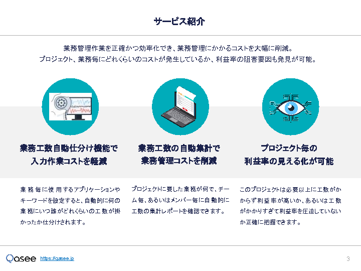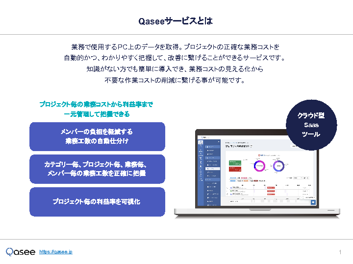 本セミナーでは、 導入企業400社以上 の実績を誇る 工数管理自動化システム「Qasee(カシー)」 をご紹介します。Qaseeは、従業員の PC操作ログ をもとに、誰が・いつ・どの業務にどれだけ時間を使ったのかを自動で可視化し、 部署別・案件(プロジェクト)別・業務別に工数を正確に分類・集計 できます。