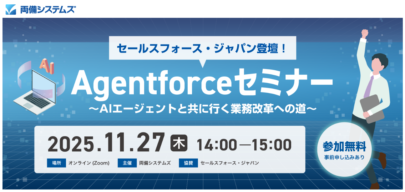 本セミナーでは、セールスフォース・ジャパンをお迎えし、Agentforceの基本的な仕組みや導入メリットを解説いただくとともに、両備システムズによる具体的な課題解決の事例や活用法をお伝えします。さらに、実際のデモを通じて、プロンプト(指示)を理解し自律的に業務を遂行するAIエージェントの可能性を体感いただけます。