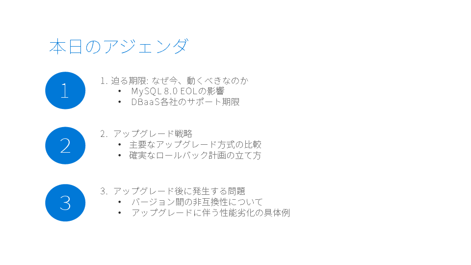 本セミナーでは、DBaaS環境(RDS / Aurora / Cloud SQL)におけるMySQL 8.0 EOL対応に焦点を当て、 失敗しないアップグレード戦略を「判断軸」の形で整理します。