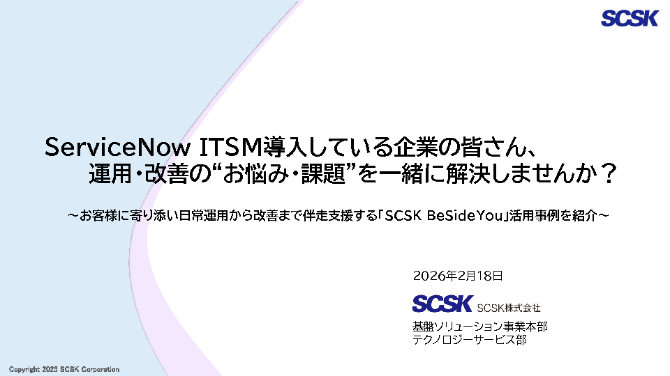 ServiceNow ITSM導入企業の皆さん、運用・改善の“お悩み”を一緒に解決しませんか? ~現場に寄り添い日常運用から改善提案まで伴走支援する「SCSK BeSideYou」活用事例を紹介~
