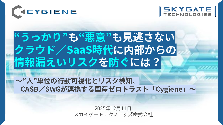 クラウド/SaaSを活用する際の利便性と安全性をいかに両立するかが、今や多くの企業に共通する課題です。本セミナーは、主にエンドユーザー企業・組織の情報システム部門やコンプライアンス担当の方を対象に開催します。それらの課題解決策として、スカイゲートテクノロジズが提供する国産ゼロトラストソリューション「Cygiene」を提案します。クラウドサービス利用を可視化する「CASB(Cloud Access Security Broker)」と安全なアクセスを制御する「SWG(Secure Web Gateway)」が密に連携し、従来の仕組みでは難しかった“人”単位での行動可視化を実現します。クラウドサービスとWebサイトを自動識別し行動データを解析して不審な兆候を早期に検知します。セキュリティはコストではなく、事業を守り成長させるための基盤です。「従業員のうっかり情報漏えいや転職者の持ち出しなどを防止したい」「従業員のクラウド利用状況を把握したい」とお考えの方は、ぜひご参加ください。