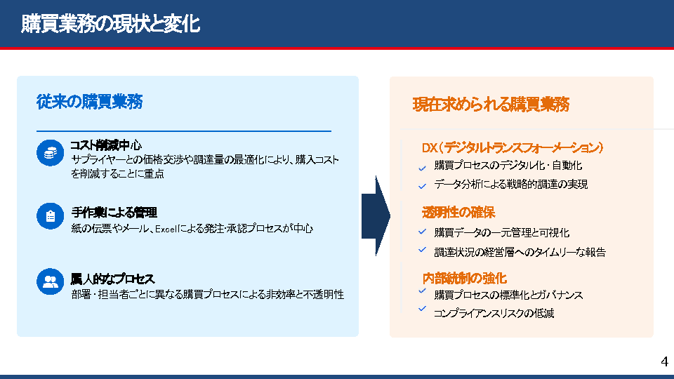企業が持続的なコスト競争力と業務の健全な運営を実現するには、企業の購買活動の相当な割合を占める間接材購買において、誰が・いつ・何を・いくらで調達しているのかを把握できる状態をつくり、標準化とルールの定着を図ることが不可欠です。
