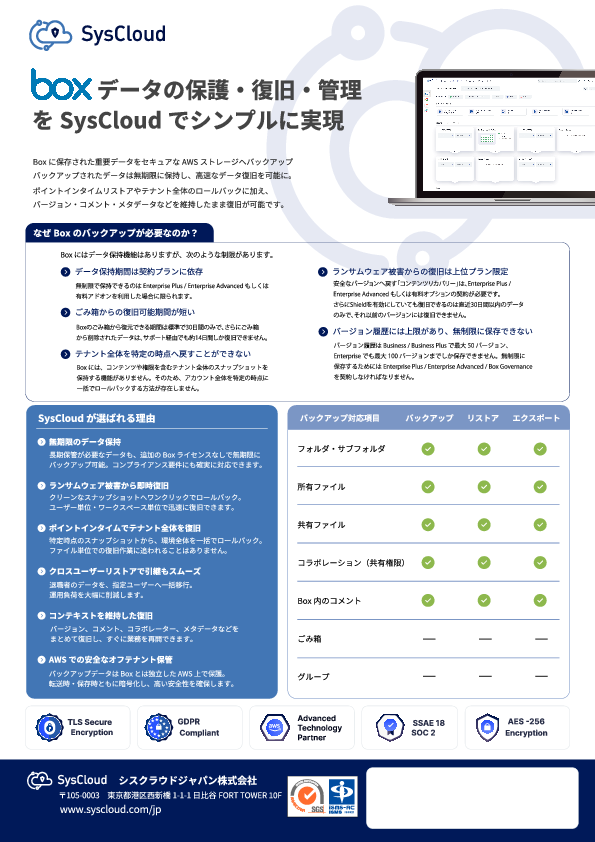 「SysCloud」は、企業が利用するSaaSデータを安全にバックアップし、必要な時点へ迅速に復旧できるソリューションです。クリーンなバックアップスナップショットを保持し、ポイントインタイムでの復旧にも対応しているため、SaaS側の障害やデータ損失が発生した場合でも、事業継続性を確保することが可能です。
