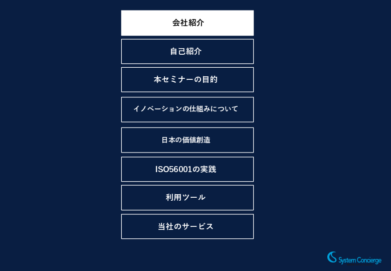 システムコンシェルジュは、この「ISO56001」の認証を日本で初めて取得した企業です。これらの経験とノウハウを活かし、ISO56001に関する基礎知識の習得支援をはじめ、マネジメント運営のための管理マニュアル・運用マニュアル・記録文書の作成、さらにプロジェクト管理ツールを活用した実践的な運用体制の構築支援まで、イノベーション・マネジメントシステム全般にわたる包括的なサービスを提供しています。
