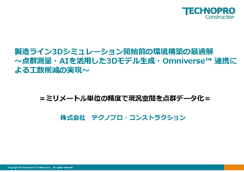 本セミナーでは、製造ラインの3Dシミュレーション構築を円滑に進めるために、現地測量から点群取得、AIによる高精度3D化、シミュレーション活用までを一気通貫で捉えた実践的なアプローチを解説します。点群データは取得方法や測量設計の段階で品質が大きく左右されるため、後工程で手戻りを発生させないための測量時の考え方や注意点にも触れながら、AIを活用し、精度・軽量化を満たした“シミュレーションに適した3D”へ短期間で変換するプロセスを具体的に紹介します。さらに、将来的なOmniverse連携を見据えたデータ構造や精度の考え方を整理し、PoCにとどまらず、設備保全業務に実装可能な3Dシミュレーション基盤をどのように構築すべきかを明確にします。