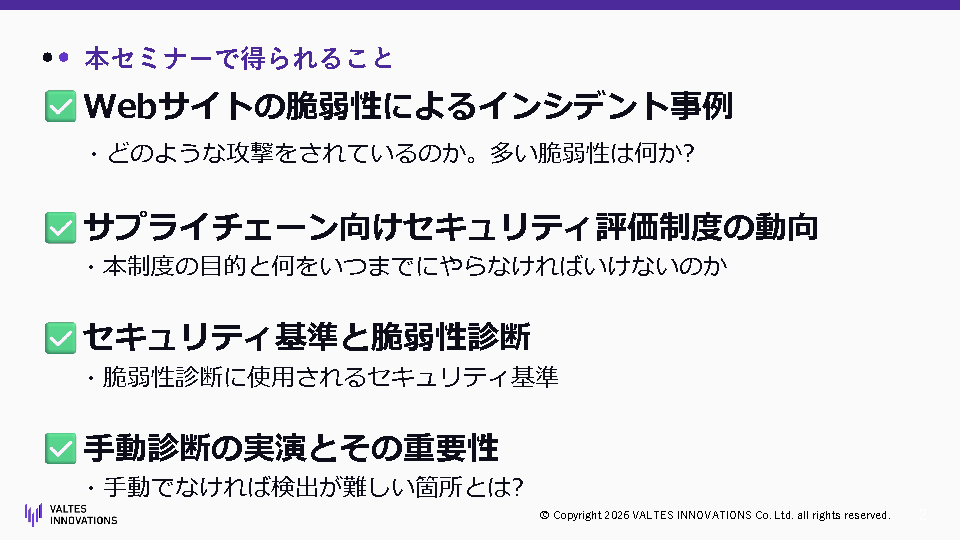 本セミナーでは、 バルテスグループが13年以上にわたり提供してきた脆弱性診断 の実績をもとに、Web/モバイル/IoTを含む幅広いシステムを対象として、ツール診断に手動診断を組み合わせることで、 認証・認可の不備やアクセス制御、業務ロジックに起因する問題 など、事故につながりやすい脆弱性を洗い出すプロセスを紹介します。また、近年実際に発生したセキュリティ事案を踏まえ、どのような脆弱性が被害につながったのか、その背景や見落とされやすいポイントについても解説します。さらに、診断結果を一覧で終わらせず、修正方針まで整理した報告書の活用方法や再診断の重要性にも触れながら、来年度の予算取りや中長期的な対策検討につなげるための、実効性ある脆弱性診断の進め方をお伝えします。