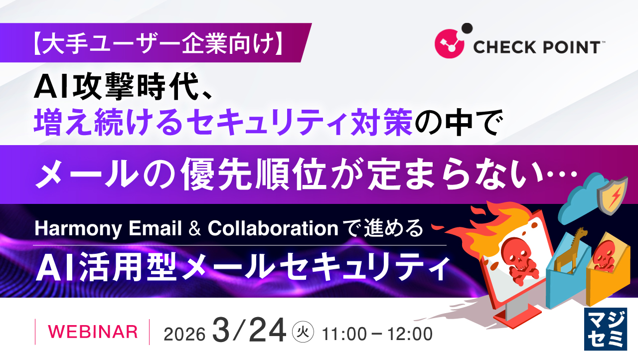 【大手ユーザー企業向け】AI攻撃時代、増え続けるセキュリティ対策の中でメールの優先順位が定まらない… ~Harmony Email & Collaborationで進める、AI活用型メールセキュリティ~お申し込み